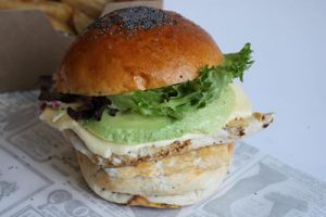• 15 – Hamburguesa de pollo grill con aguacate, mezclum y queso Havarti