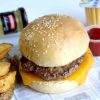 Hamburguesa con queso, patatas, zumo y Petit suisse